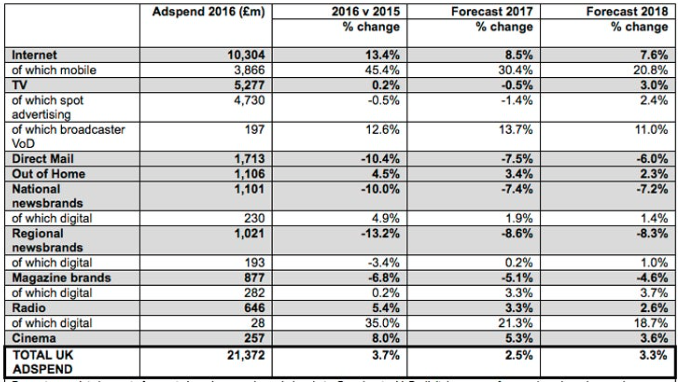 Internet spend dominates, up 13.4% to £10.3 bn for 2016. Mobile accounted for 99% of that growth, with ad spend for mobile platforms up a significant 45.4% to £3.9bn.