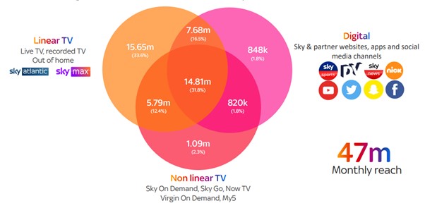 SKY has a combined monthly reach of 47 million across linear & digital platforms with 42% of all adults watching Sky VOD every month.