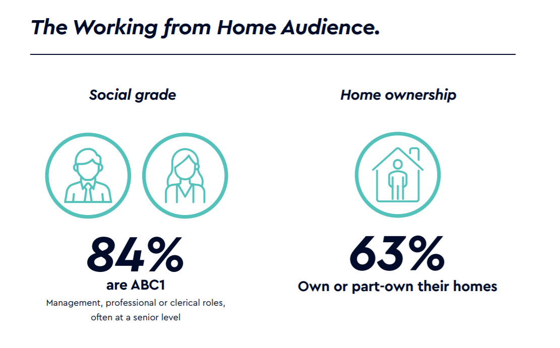This new WFH audience is affluent, with 84% being ABC1, and 63% owning or part-owning their own home.