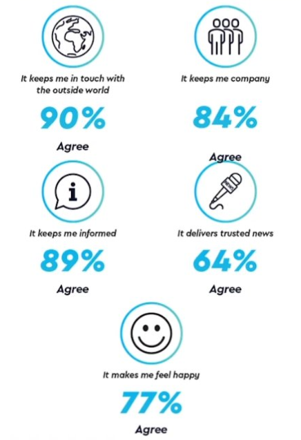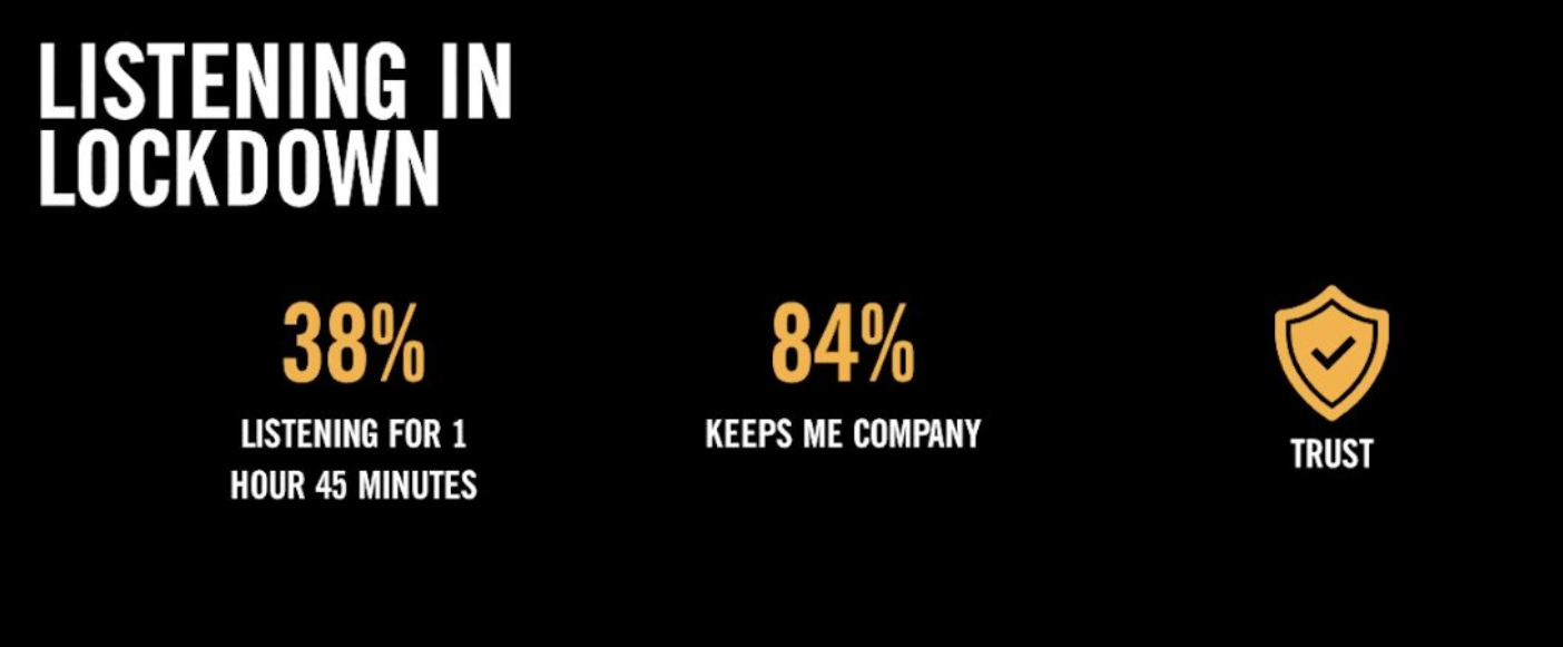 The main reason people give for listening to radio during lockdown is for company [84%], it is also a trusted source of news, and makes people feel happy [77%].