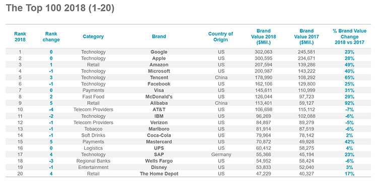 Tech giants Google and Apple lead the way, with both breaking the $300bn brand value threshold for the first time. Google took first place with a brand value of $302bn, following their 23% rise while Apple is just behind with a value of $301bn after their 28% rise.
