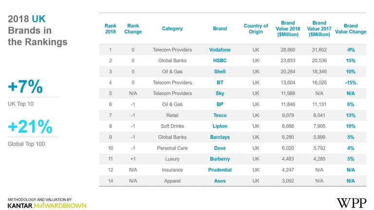 It’s not been the best year for UK brands as only four make it into the top 100. Vodafone is the most valuable UK brand (37th in the global rankings) despite a 9% decline in value over the past 12 months. HSBC has grown by 15% but despite this drops down two spots to 50th. Shell also dropped to 63rd despite a growth of 10%. BT narrowly makes it in at 94th, following a 15% decline.