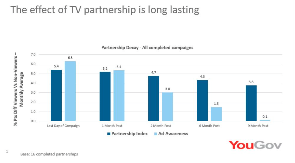 On average, looking at 16 completed sponsorships one month after they ended, the key brand health measures were unchanged. Six months after the sponsorships had ended they had reduced by 19%, meaning that 81% of the advantage gained with viewers of the sponsored TV show was still active.
