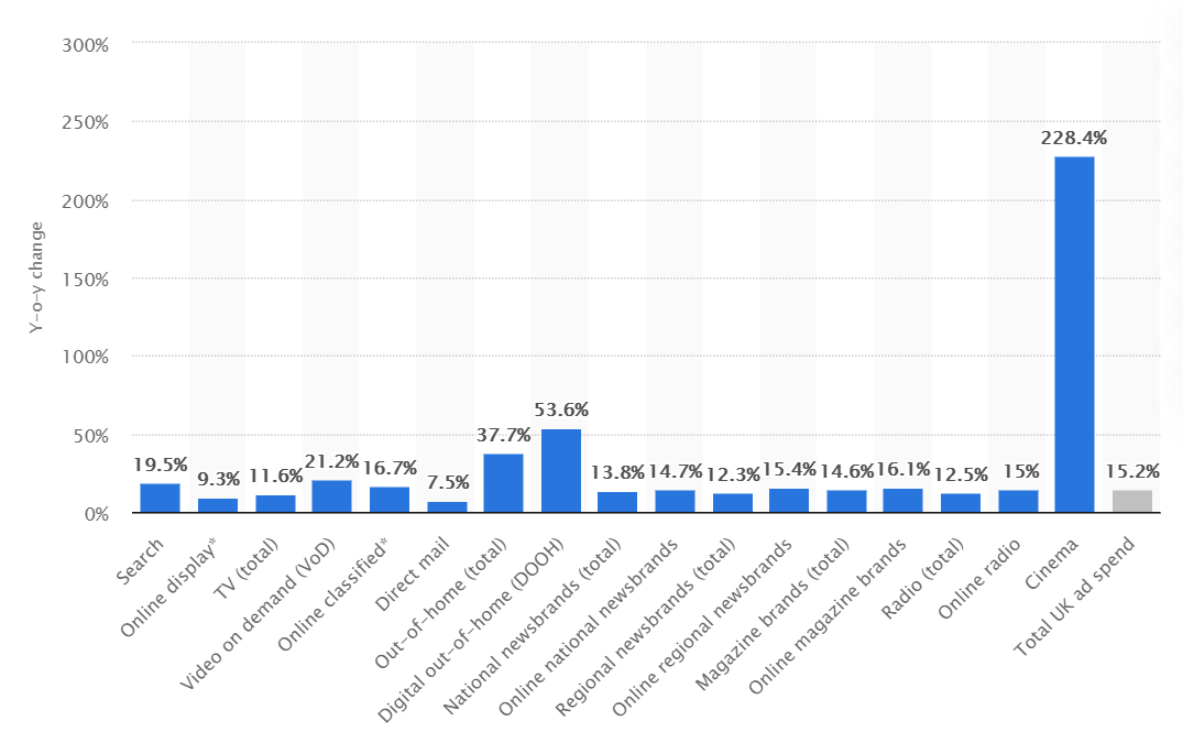 Particularly strong results are expected in cinema at 228.4% and reflective of the fact the sector was closed for most of 2020; digital out of home at 53.6%, traditional out of home at 37.7%, and video on demand at 21.2%. (Advertising Association).