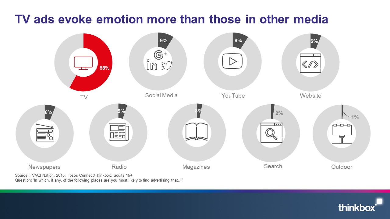 Thinkbox’s ‘TV Nation’ work showed that TV ads were by far the most likely to make people feel emotional, and creating an emotional response is incredibly effective in advertising. In the UK, 58% stated television is where they are most likely to find advertising that makes them feel emotional in comparison to 9% for social media and 6% for newspapers.