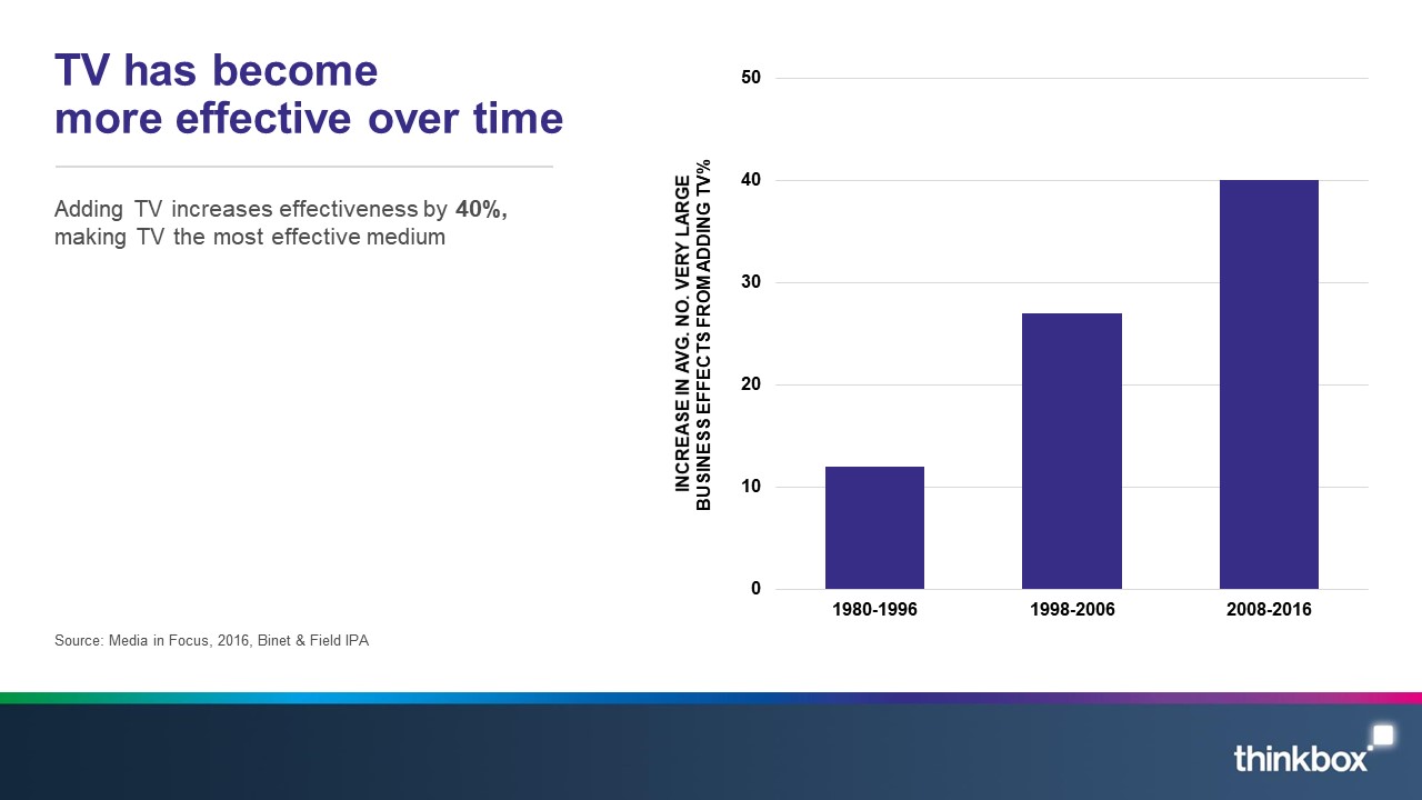 Things such as sales, profit, and market share – and, the more business effects, the more commercially successful the campaign will be. Between 1980–1996, adding TV to a campaign led to an average 12% increase in business effects. This increased to 40% during 2008–2016.