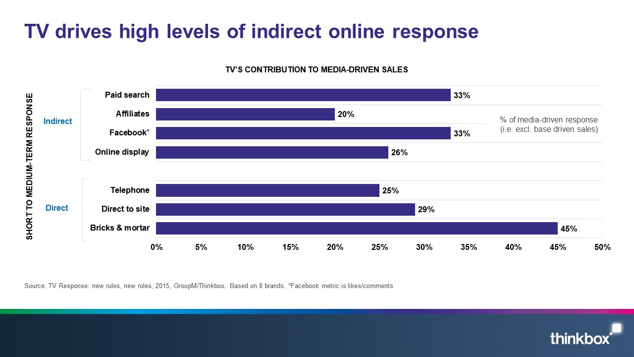 TV is also responsible for driving an indirect response through online channels, generating 33% of media-driven sales via paid-for online search; 26% of media-driven sales via online display and 20% of media-driven sales via affiliate marketing. TV is responsible for driving 33% of all media driven interactions for brands on Facebook, e.g. likes and comments