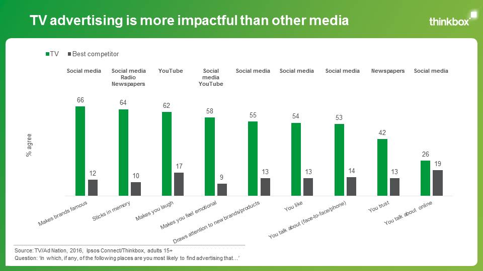 Thinkbox’s ‘TV Nation’ study demonstrated that TV advertising sticks in our brains and drives brand-fame. It is 6 x more memorable than the next best competitor and the medium that is most likely to drive emotion, make people laugh, drive conversation and be liked.