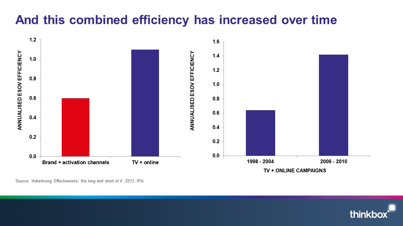 TV drives activity elsewhere in the media eco-system and consistently makes other elements of advertising campaigns work harder. TV and online synergy is particularly large. In fact, campaigns that use TV and online together are twice as efficient as those that incorporate brand advertising with other kinds of activation channels. The synergy between TV and online has been increasing over time, with efficiency more than doubling since 2006.