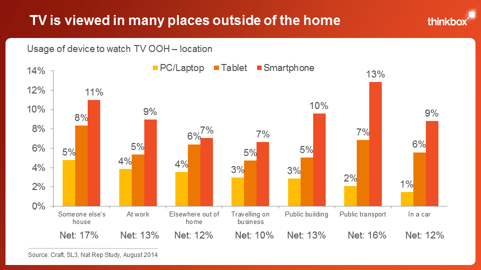 Perhaps one of the most interesting benefits of device proliferation – particularly for advertisers – is the fact that we can now consume TV wherever we go. Over a third (37%) of people in a Thinkbox survey claimed to have watched TV when out and about.